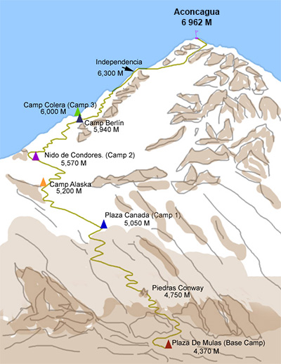 5. CC1e : « , les deux seuls dangers sont l'altitude et la météo. Techniquement , on est sur un GR qui monterait à 6964m (peut etre un peu plus compliqué les 200 derniers mètres ?) dans tous les cas , la Canaleta est bien moins dure que la montée à l'aiguille du gouter . » ; « une fois que tu as maitrisé la météo et l'acclimatation , il y a 2 clés de succés : la légèreté maximale , […] et peut etre une dernière nuit assez haute (style independancia à 6400) pour réduire au maxi le denivellé final .Je me suis aperçu les deux fois que 1000m dans la dernière journée (5900 au camp Berlin pour 6964 au sommet) , ca te met en zone rouge. »