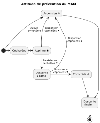 Attitude de prévention du MAMAttitude de prévention du MAMCéphaléesAscensionAspirineDescente1 campCorticoïdeDescentefinaleAucunsymptômeDisparitioncéphaléesPersistancecéphaléesDisparitioncéphaléesPersistancecéphalées