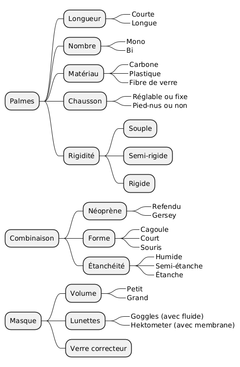 PalmesLongueurCourteLongueNombreMonoBiMatériauCarbonePlastiqueFibre de verreChaussonRéglable ou fixePied-nus ou nonRigiditéSoupleSemi-rigideRigideCombinaisonNéoprèneRefenduGerseyFormeCagouleCourtSourisÉtanchéitéHumideSemi-étancheÉtancheMasqueVolumePetitGrandLunettesGoggles (avec fluide)Hektometer (avec membrane)Verre correcteur