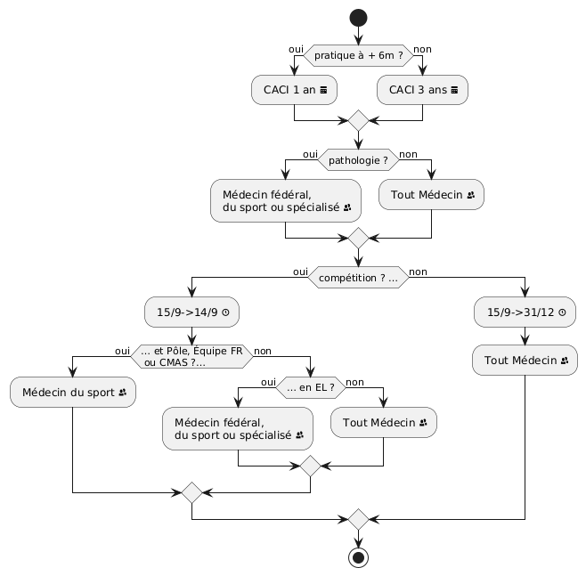 pratique à + 6m ?ouinonCACI 1 anCACI 3 anspathologie ?ouinonMédecin fédéral,du sport ou spécialiséTout Médecincompétition ? …ouinon15/9->14/9… et Pôle, Équipe FRou CMAS ?…ouinonMédecin du sport… en EL ?ouinonMédecin fédéral,du sport ou spécialiséTout Médecin15/9->31/12Tout Médecin